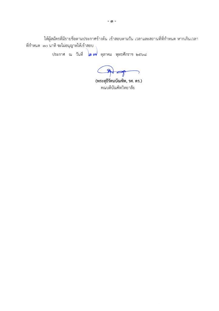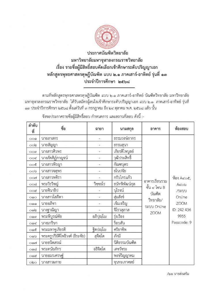 ตามที่หลักสูตรพุทธศาสตรดุษฎีบัณฑิต แบบ ๒.๑ ภาคเสาร์-อาทิตย์ บัณฑิตวิทยาลัย มหาวิทยาลัยมหาจุฬาลงกรณราชวิทยาลัย ได้รับสมัครผู้สนใจเข้าศึกษาระดับปริญญาเอก แบบ ๒.๑ ภาคเสาร์-อาทิตย์ รุ่นที่ ๑๓ ประจำปีการศึกษา ๒๕๖๘ ตั้งแต่วันที่ ๓ กรกฎาคม ถึง ๒๔ ตุลาคม พ.ศ. ๒๕๖๘ แล้ว นั้น