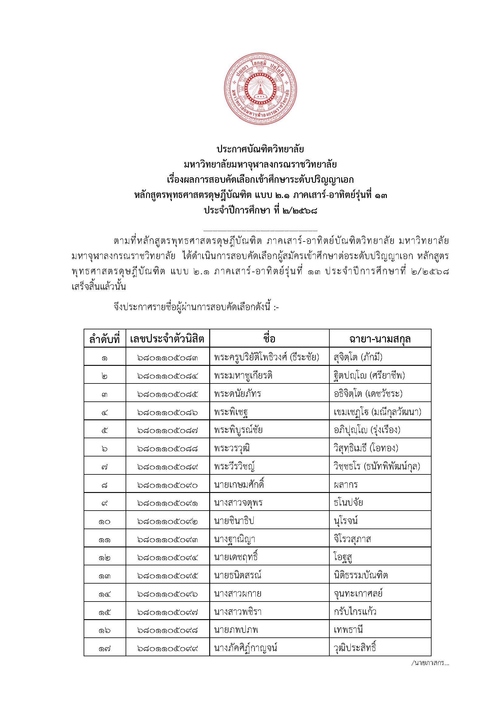 มหาจุฬาลงกรณราชวิทยาลัย ได้ดำเนินการสอบคัดเลือกผู้สมัครเข้าศึกษาต่อระดับปริญญาเอก หลักสูตรพุทธศาสตรดุษฎีบัณฑิต แบบ ๒.๑ ภาคเสาร์-อาทิตย์รุ่นที่ ๑๓ ประจำปีการศึกษาที่ ๒/๒๕๖๘